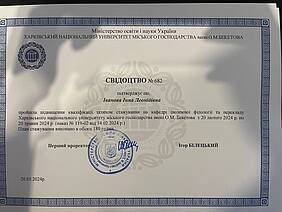 Старший викладач кафедри іноземних мов Іванова І.Л. пройшла підвищення кваліфікації (стажування) на кафедрі іноземної філології та перекладу Харківського національного університету міського господарства імені О.М. Бекетова з 20 лютого 2024 р. по 20 травня 2024 р., отримала свідоцтво № 682 (загальний обсяг 180 годин).