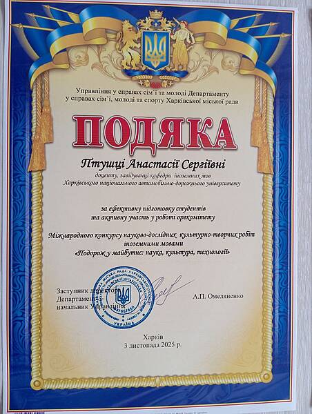 Викладачі кафедри іноземних мов Харківського національного автомобільно-дорожнього університету завідувачка кафедри, доцент Птушка Анастасія Сергіївна, професор Саєнко Наталія Віталіївна, доцент Скрипник Наталія Станіславівна та викладач Лук'яненко Наталія Миколаївна отримали Подяки від Управління у справах сім’ї та молоді Департаменту у справах сім’ї, молоді та спорту Харківської міської ради.