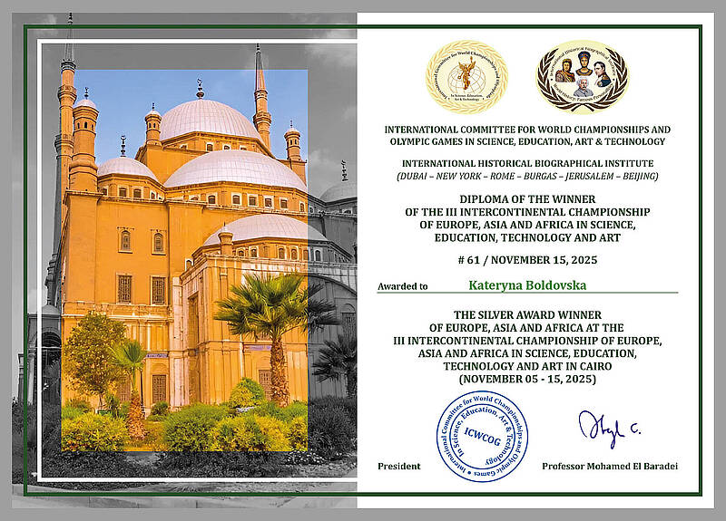 Доцентка кафедри обліку і оподаткування Болдовська Катерина Петрівна отримала срібну нагороду ІІІ Міжконтинентального чемпіонату Європи, Азії та Африки з науки, освіти, технологій та мистецтва, що проходив у Каїрі з 5 по 15 листопада 2025 року.