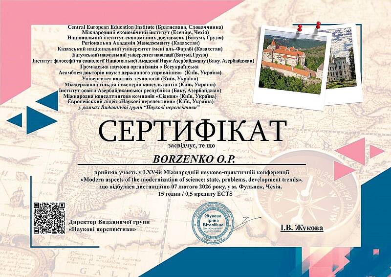 07 лютого 2026 року, Чехія, м. Фульнек, доцент кафедри іноземних мов Борзенко О.П. активно взяла участь у LXV-ій Міжнародній науково-практичній конференції «Modern aspects of the modernization of science: state, problems, development trends» та публікації наукової статті "Application of information and communication technologies in the educational process of higher education".