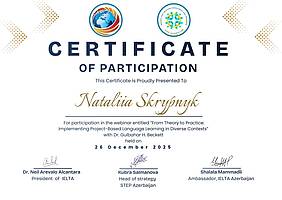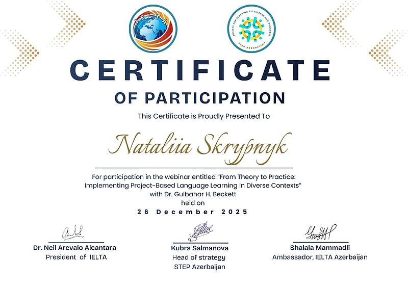 Доцент кафедри іноземних мов Наталія Скрипник як активний учасник міжнародної асоціації викладачів англійської мови IELTA, взяла участь в заході "Від теорії до практики: впровадження проєктно-орієнтованого вивчення мови у різних контекстах".