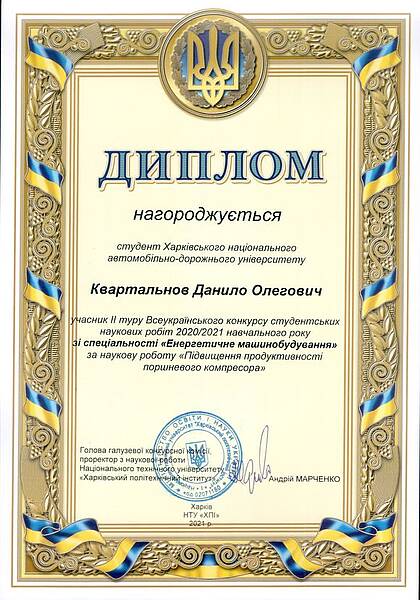 Колектив кафедри щиро вітає студентів Ємцова В.Е., Квартальнова Д.О., Юрченка Р.В, які брали участь у Всеукраїнському конкурсі студентських наукових робіт зі спеціальності "Енергетичне машинобудування" і отримали дипломи учасників ІІ туру за результатами рішення галузевої конкурсної комісії НТУ "ХПІ".