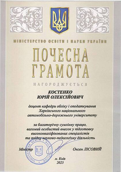 Щиро вітаємо доцента кафедри обліку і оподаткування, гаранта ОП «Облік і оподаткування» першого (бакалаврського) рівня вищої освіти, заступника декана ФУБ з навчально-методичної роботи Костенка Юрія Олексійовича з отриманням Почесної грамоти Міністерства освіти та науки України за багаторічну сумлінну працю, вагомий особистий внесок у підготовку висококваліфікованих спеціалістів та плідну науково-педагогічну діяльність.