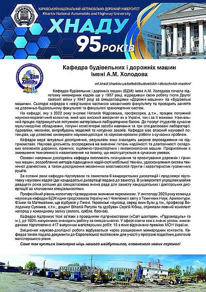 Нещодавно каф Будівельних і дорожніх машин ім. А.М. Холодова відмітила своє 95 річчя і є однією зі старіших кафедр Харківського національного автомобільно-дорожнього університету.