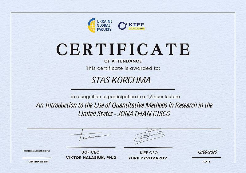 Частина здобувачів отримала сертифікати за результатами проходження міжнародного курсу “An Introduction to the Use of Quantitative Methods in Research in the United States” (лектор — Jonathan Cisco) по програмі Ukraine Global Faculty спільно з KIEF Academy. Участь у програмі взяли Юрій Гоголенко, Катерина Діхтяренко, Станислав Корчма, Ганна Мусієнко, Анастасія Резніченко. Курс був спрямований на опанування базових підходів до застосування кількісних методів у наукових та прикладних дослідженнях, що є важливою складовою техніко-економічного аналізу.