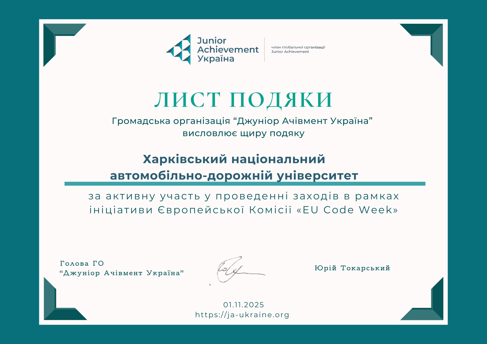 ХНАДУ взяв участь у Європейському тижні кодування (EU Code Week 2025), міжнародній ініціативі, що популяризує програмування та цифрову грамотність. Цьогорічна ініціатива, яку в Україні координує Junior Achievement Ukraine (JA Ukraine) за підтримки...